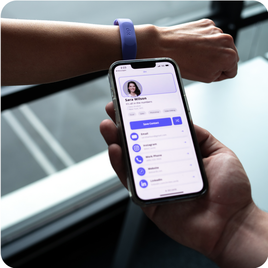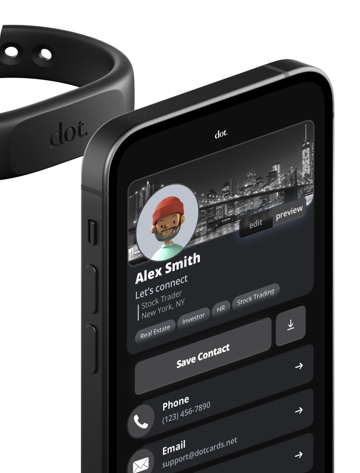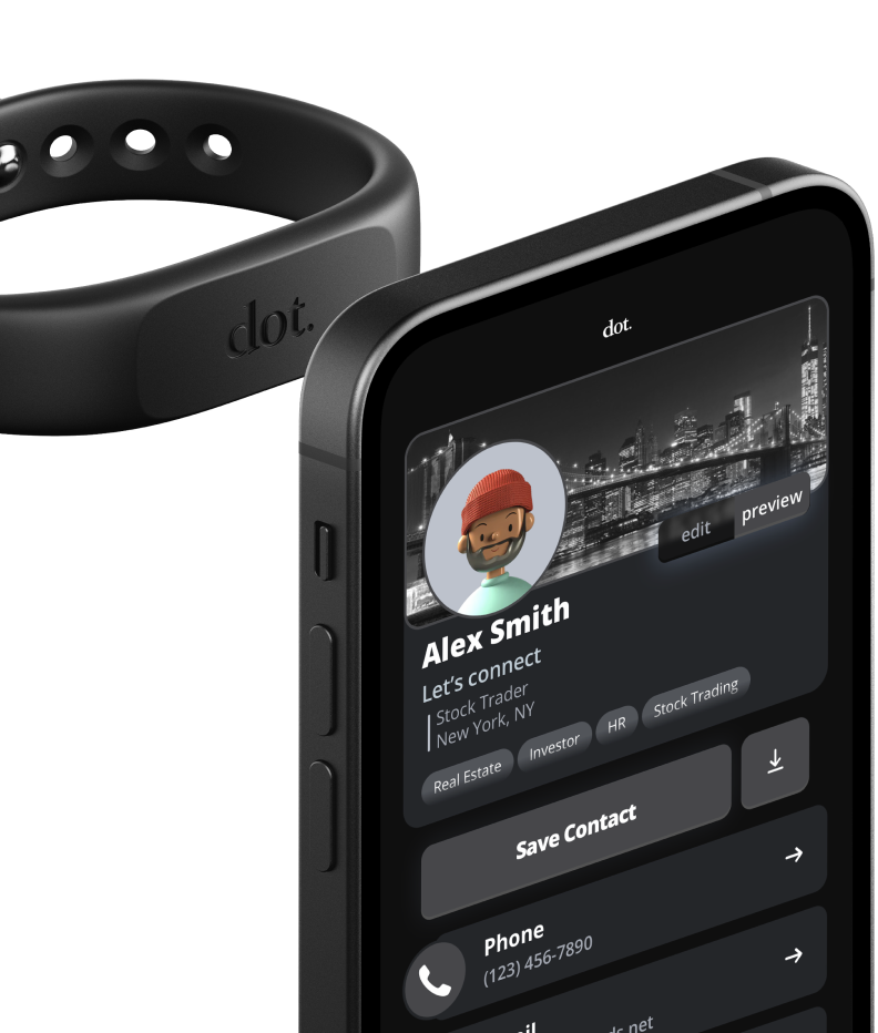 A dot.device seamlessly transfers all of the information on your dot.Profile with a single tap onto someone else’s phone. Your dot.Profile is fully customizable —including a bio, social media links, payment info, and more— and enables you to share every important detail about you and your business with your network.