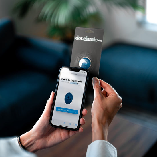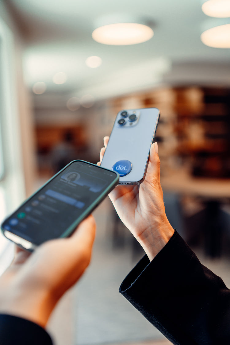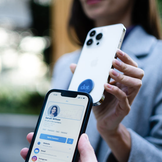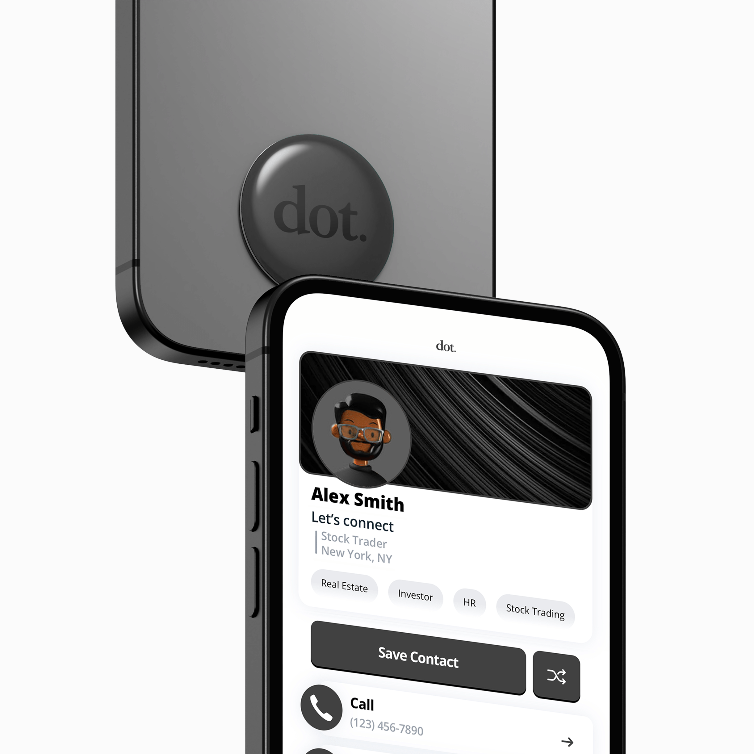 A dot.device seamlessly transfers all of the information on your dot.Profile with a single tap onto someone else’s phone. Your dot.Profile is fully customizable —including a bio, social media links, payment info, and more— and enables you to share every important detail about you and your business with your network.